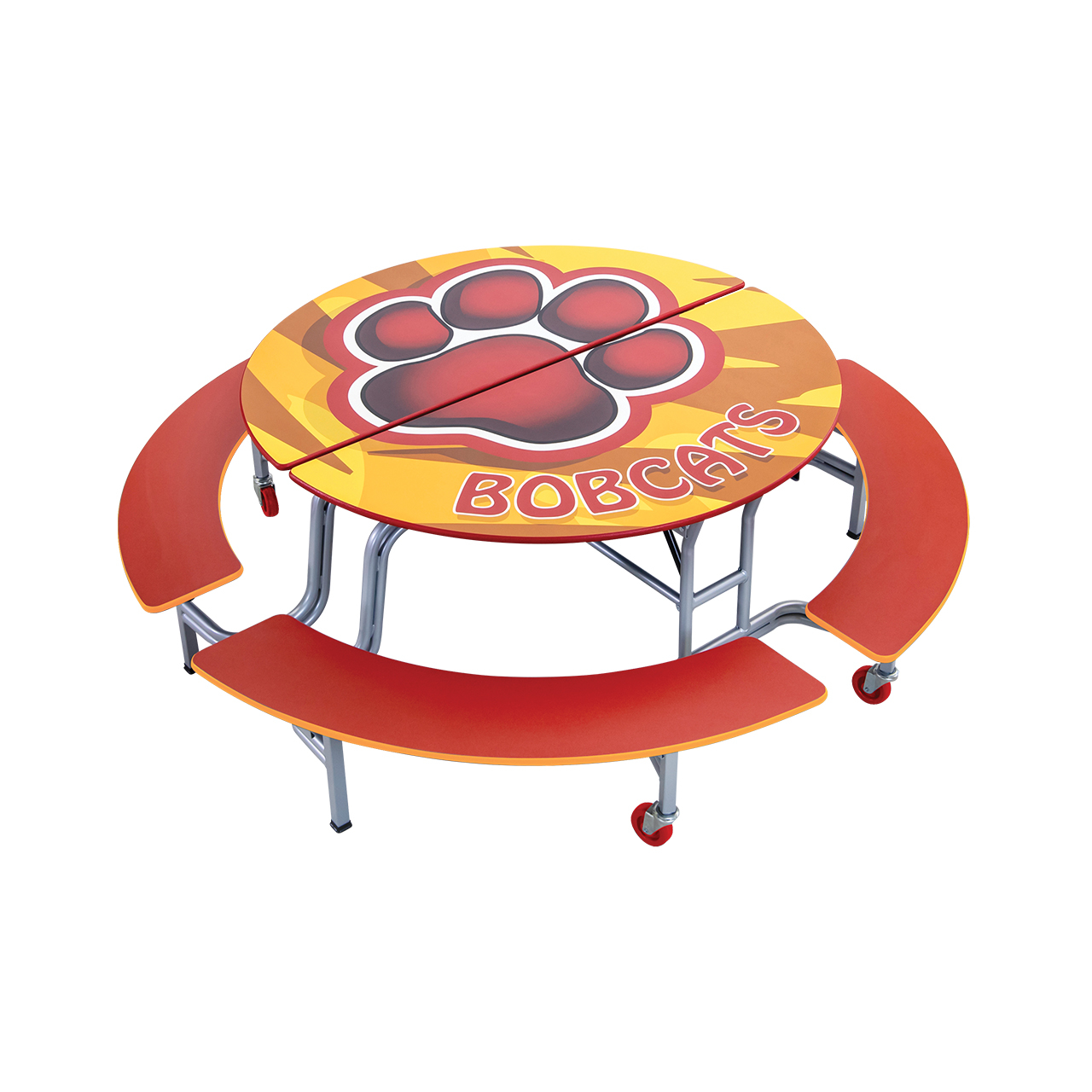 Our classic cafeteria Mobile Bench Table - Round is made with high quality parts and is the perfect fit for any event. AmTab's Mobile Bench Table - Octagon has a 60" Round Diameter, 4 benches, and can be easily folded and stored with ease.